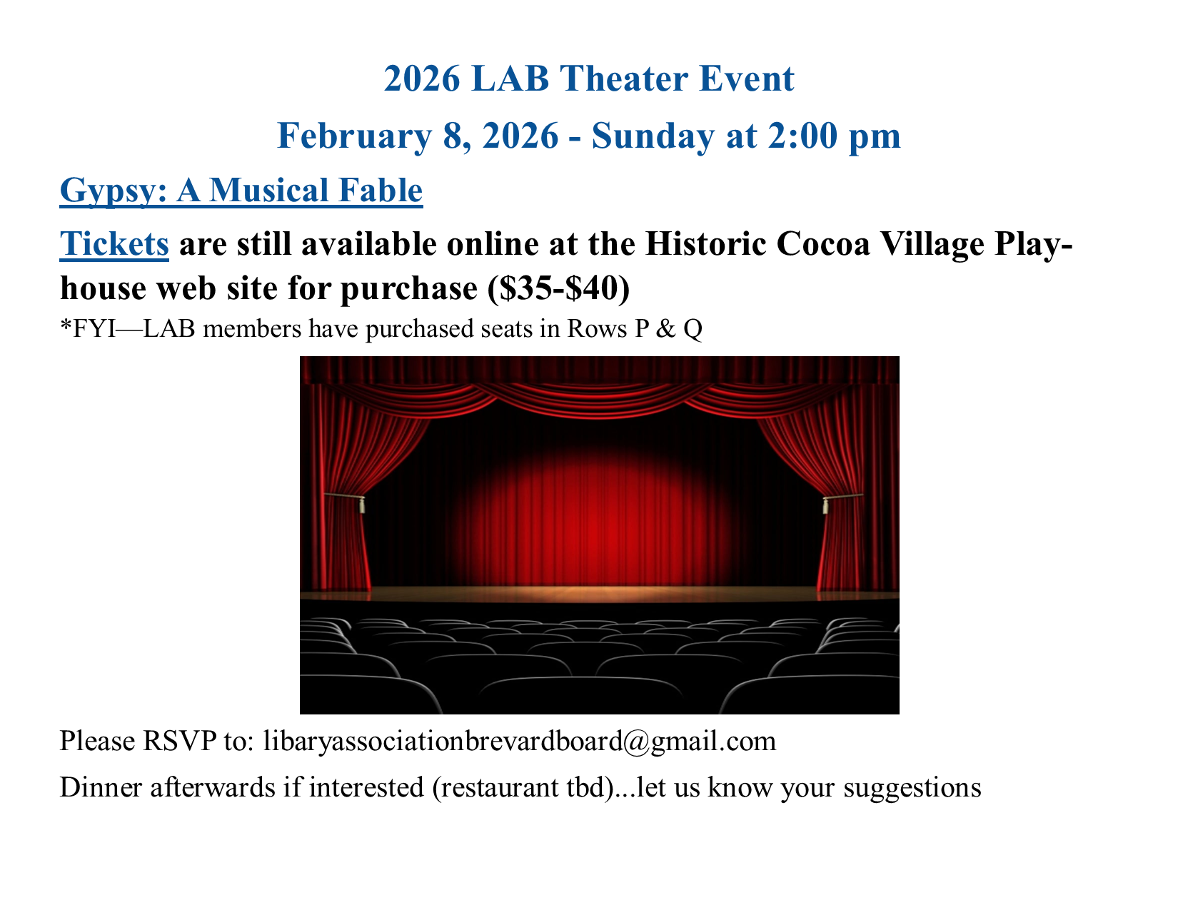 Please join us for LAB’s Annual Theater Event on Sun. Feb. 8th at 2:00 PM